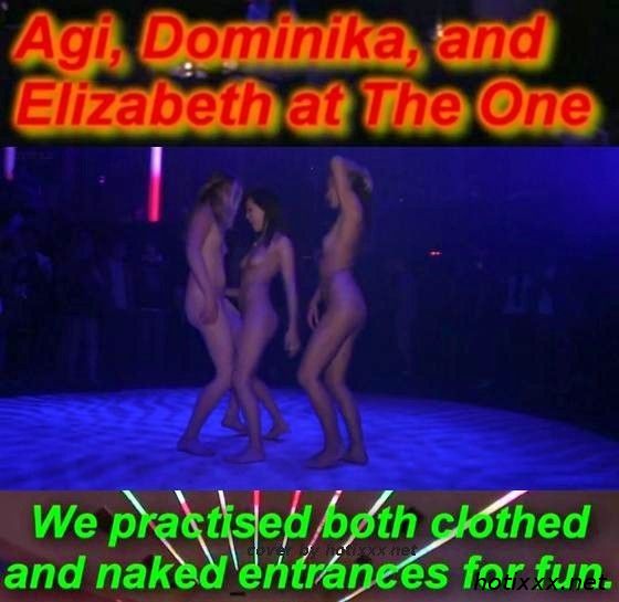 The One Club, a deluxe club in Barcelona noted for its wonderful lighting effects. The girls walk in naked and dance together in front of the crowd, and then climb up on a platform and dance in the laser lights high up above where everyone can see them. Dominika decides to be more daring and walks down into the crowd alone, to dance freely and quite naked in their midst...