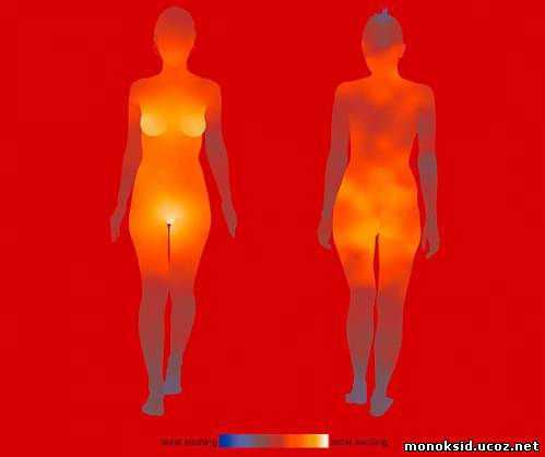 Градация от холодных к теплым цветам (от синего к белому) отвечает градации от меньшего к большему желанию прикоснуться или же желанию ощутить прикосновение. Участки тела, на которых женщинам хотелось бы ощущать прикосновения партнера.